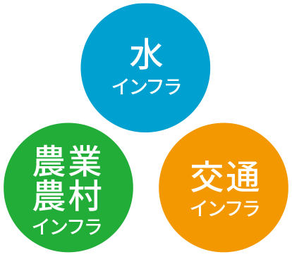 私たちは建設コンサルタントとして、社会資本整備の中で3つの主な分野で調査・計画・設計等の業務を行っております