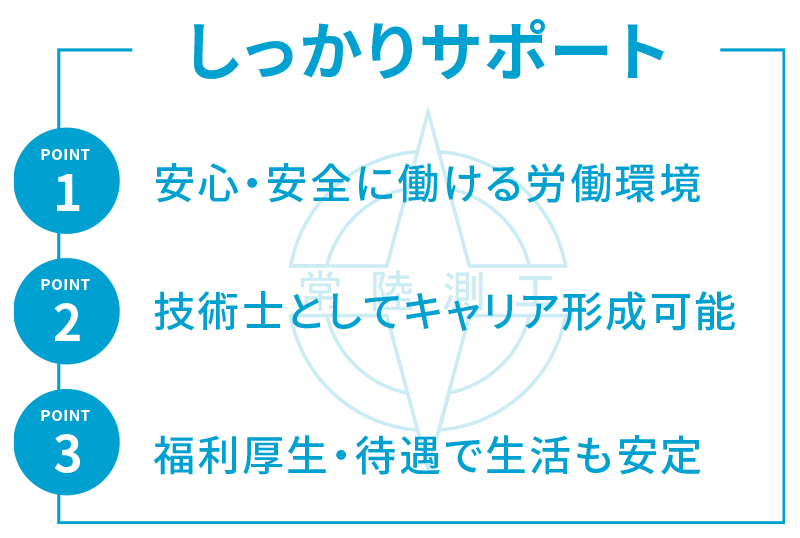 上司や先輩技術者の指導のもと、まずは図面作成や積算の補助業務からスタート。公共事業の流れや設計の基礎を学びながら、段階的に業務の幅を広げていける環境です。
