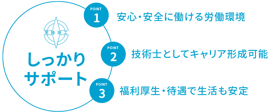 様々なインフラを支えるやりがいある仕事を手伝ってくれる仲間を探しています。設計技術の仕事、それを補助する仕事、官公庁相手の営業の仕事、それらをサポートする事務の仕事と幅広く募集中。常陸測工は、がんばる人を精一杯応援します。入社後はベテラン社員によるサポート、教育も充実、まずはお気軽にエントリーしてみてください。インフラを支え、地域に貢献したい人からのご応募お待ちしております。